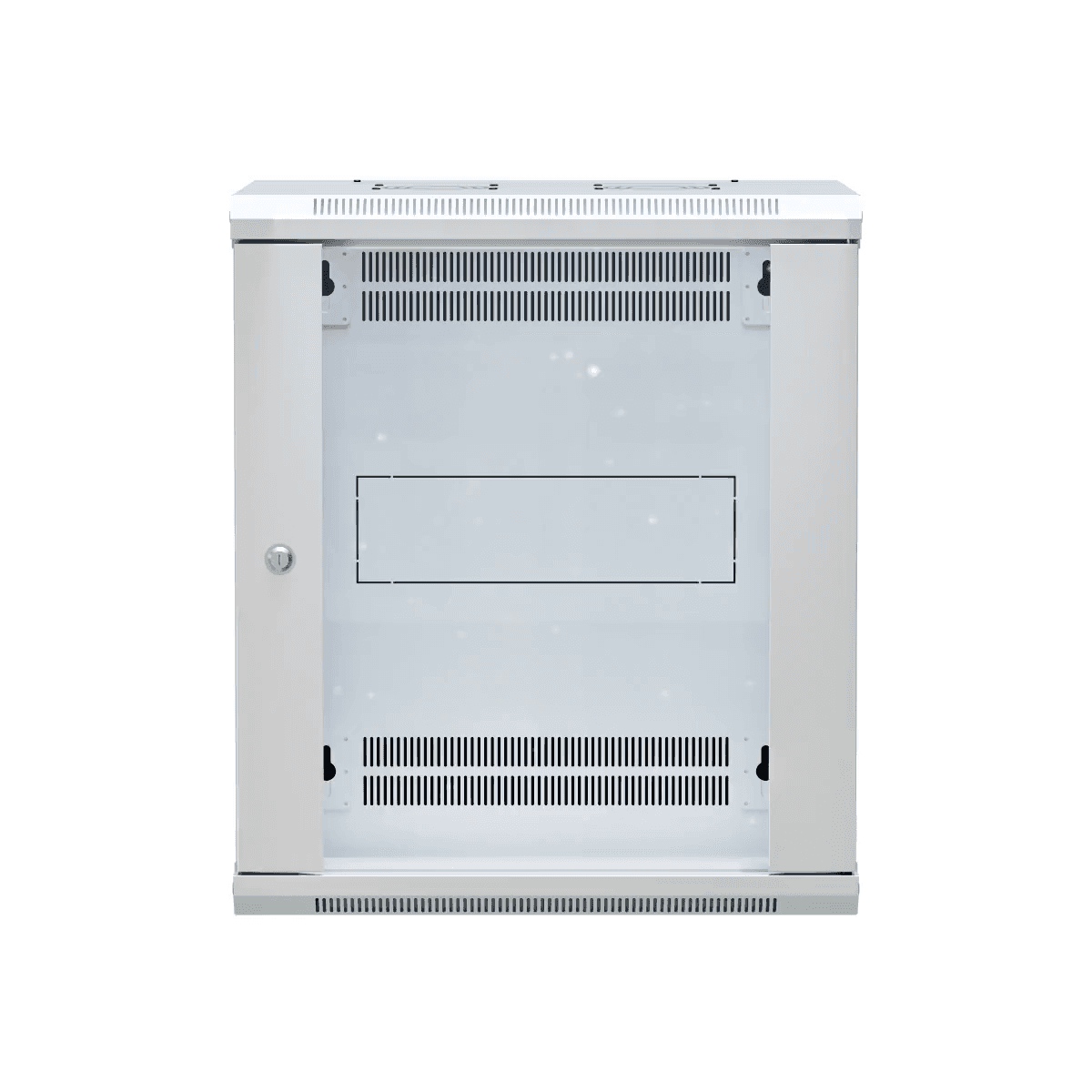 Fully assembled wall-mount rack with built-in fans and removable panels, engineered for easy equipment access and space-efficient small-scale deployments.