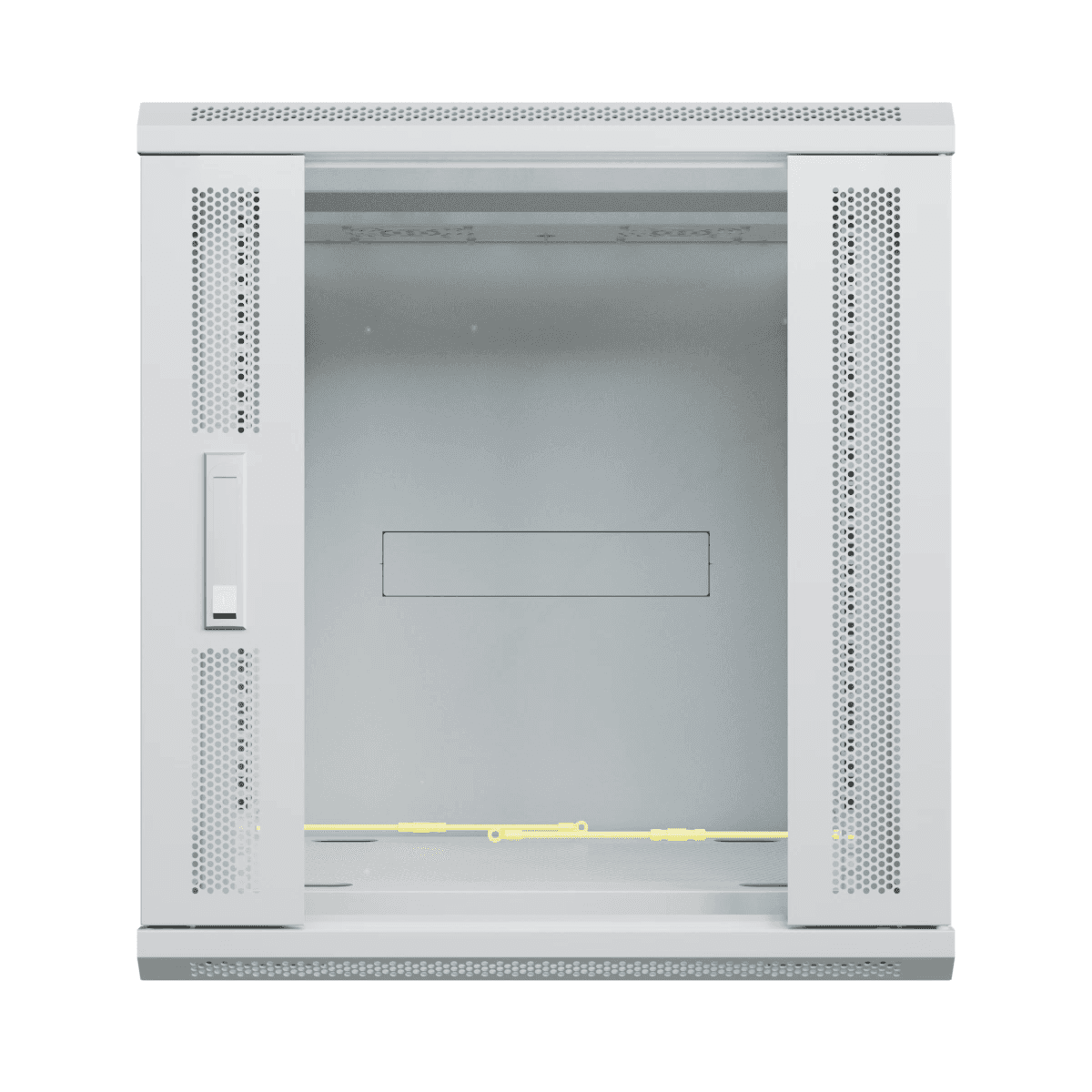 Fully assembled, compact and wall-mount rack cabinet with glass front, dual fans, and removable side panels.